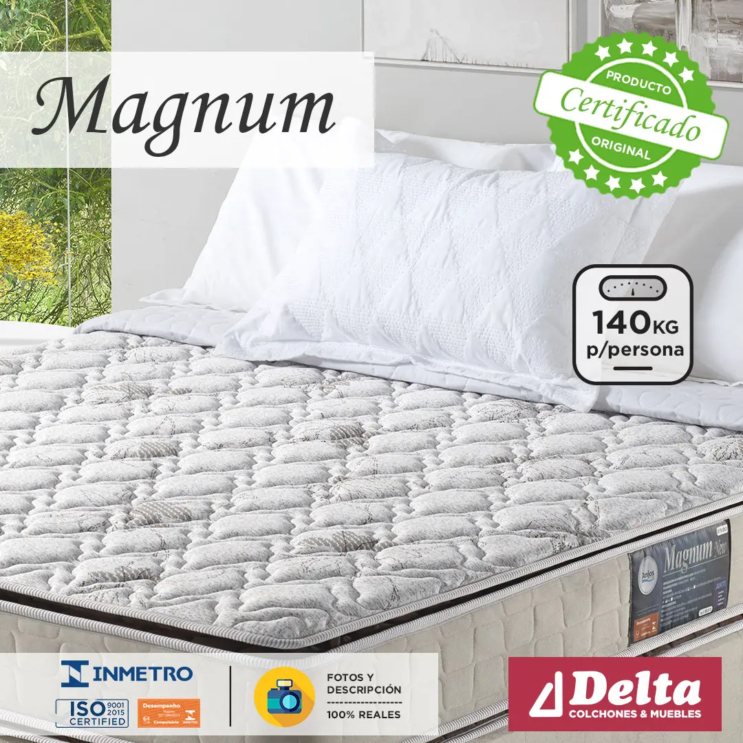 El colchón Magnum está fabricado 100% en espuma de poliuretano, con núcleo de espuma AG Densidad 70 Extra Firme y doble Pillow Top Densidad 28, certificada por el laboratorio INMETRO (Instituto Nacional de Metrología, Calidad y Tecnología). Las espumas de poliuretano son mullidas, adaptables y tienen la capacidad de conservar su forma original durante mucho tiempo.