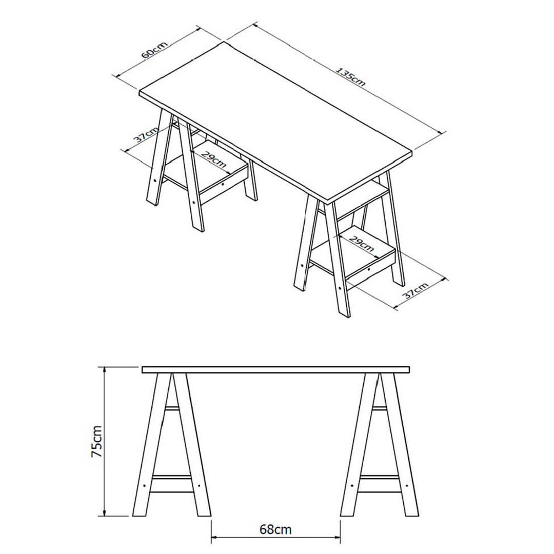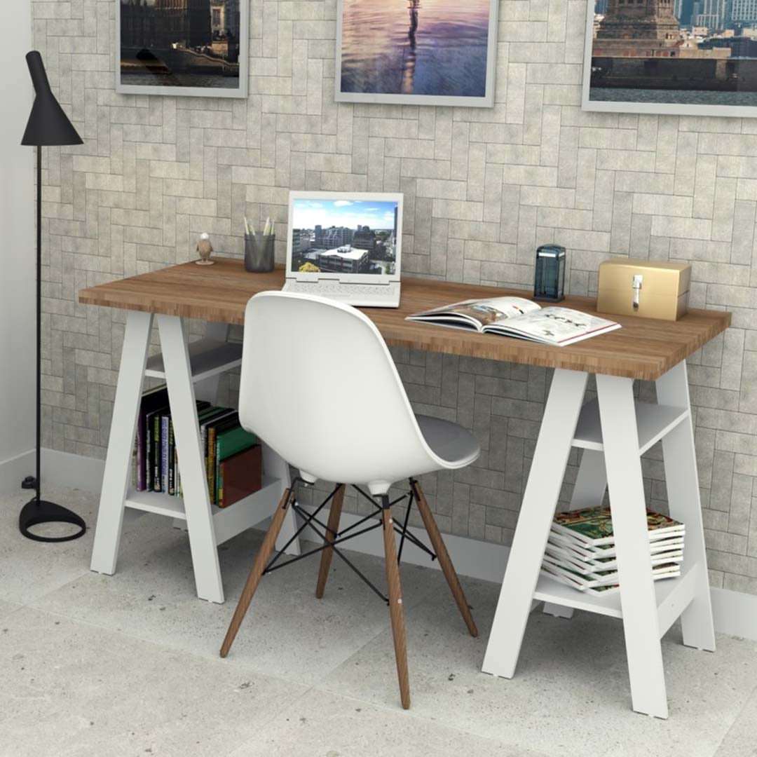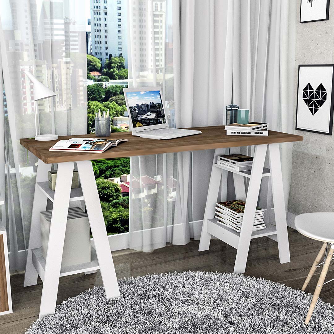 Gran y moderno escritorio con caballetes, amplio espacio de trabajo.