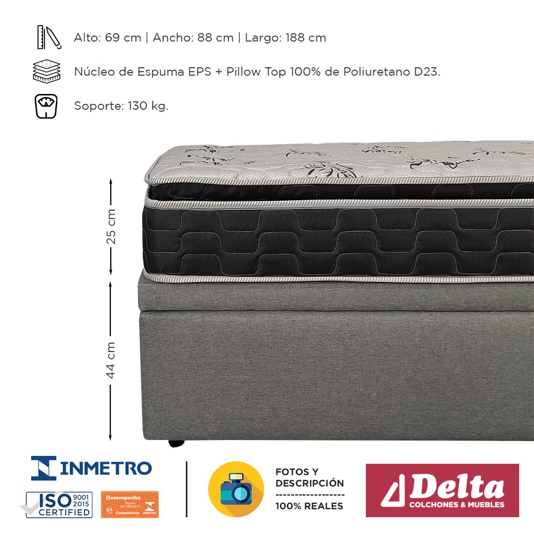 Cuenta con un núcleo rígido de espuma de poliestireno expandido (EPS) que brinda una firmeza similar a la de una densidad 60 y un soporte de hasta 130 kg por persona, con un toque final de dos láminas de espuma soft en el Pillow Top que otorgan excelente descanso y mayor confort.